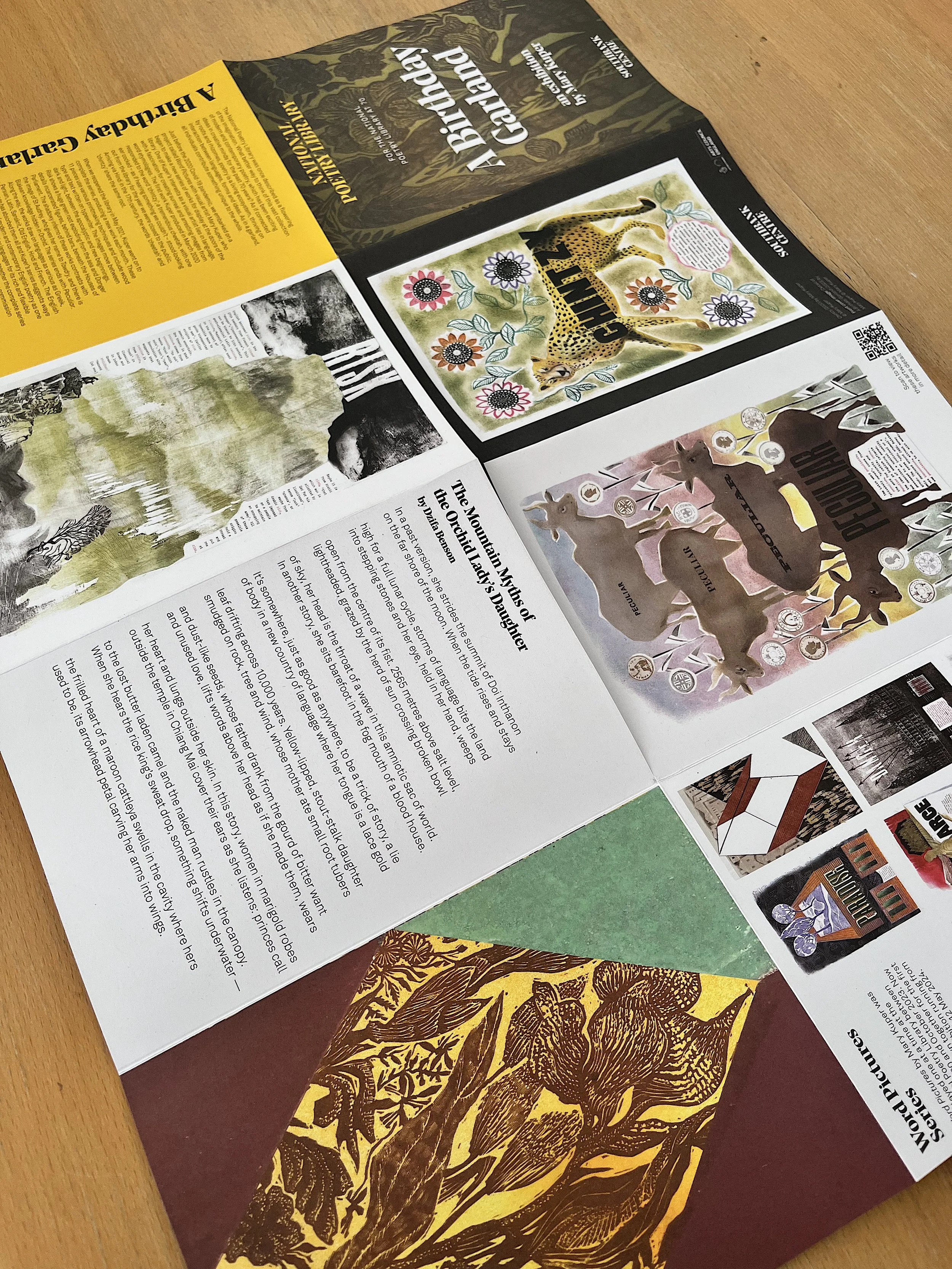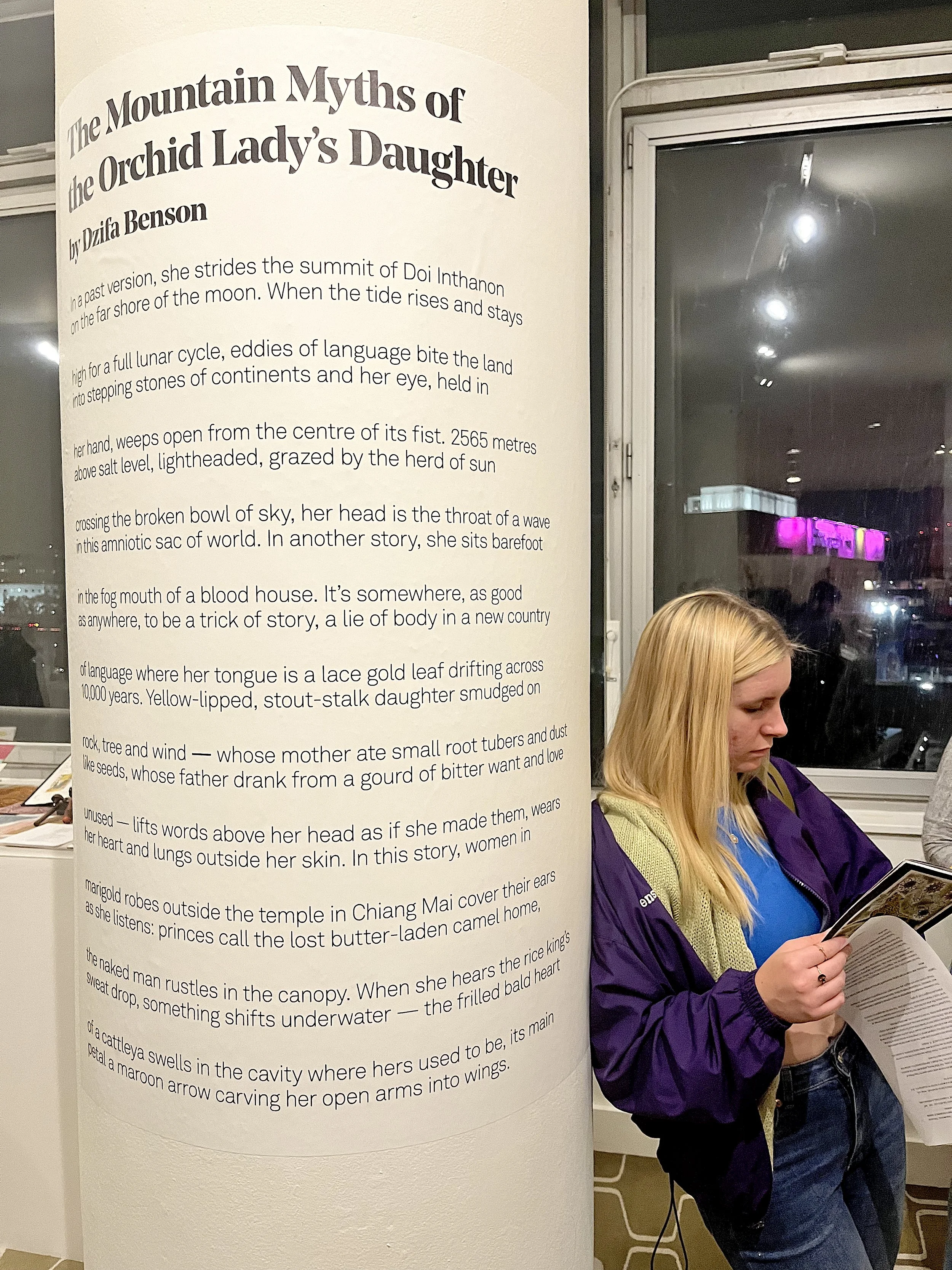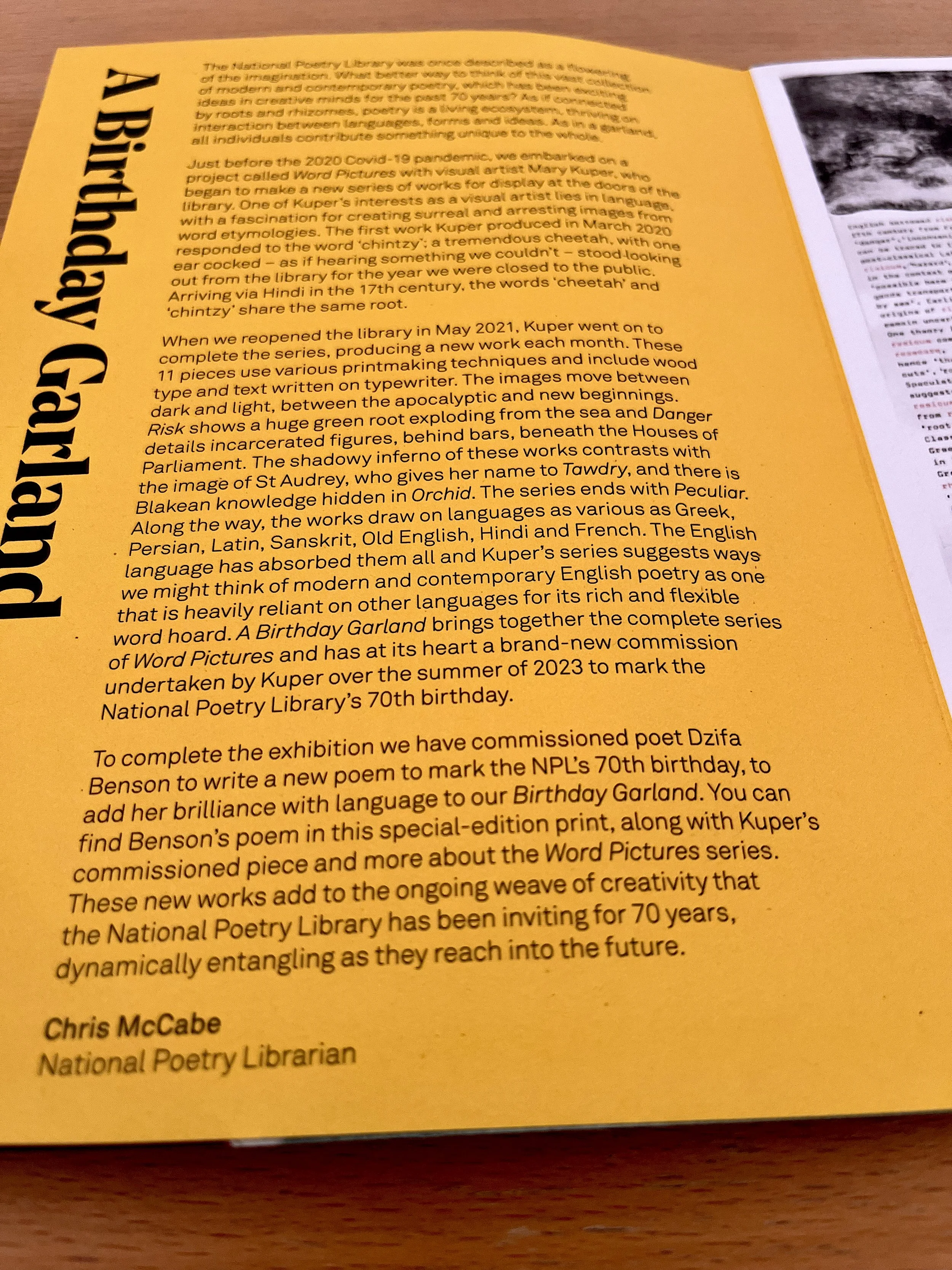 For the launch of A Birthday Garland, an exhibition of word pictures by the artist Mary Kuper to celebrate the National Poetry Library's 70th birthday, I was commissioned to write the poem - The Mountain Myths of the Orchid Lady's Daughter - in response to Mary's work. The poem formed part of the poster, also designed by Mary, commemorating the occasion. Just before the launch, the library asked me if the poem could be displayed as part of the exhibition too which I wasn't expecting. And then for it to be displayed so large and prominently also took me by surprise. I was grateful and honoured that Mary requested me specifically to do this 10 years after the one and only time I'd met and worked with her previously. Especially so because I absolutely adore Mary's work.